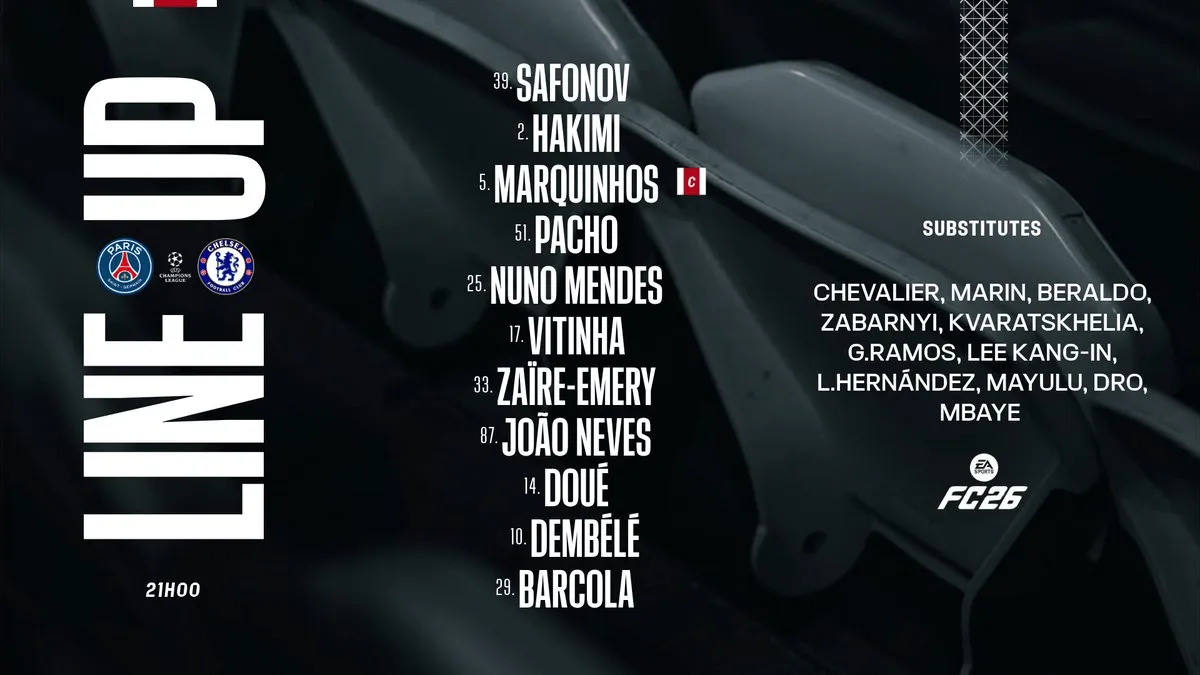 巴黎圣日耳曼首发:39-萨福诺夫、2-阿什拉夫、5-马尔基尼奥斯、25-努诺-门德斯、51-帕乔、17-维蒂尼亚、33-扎伊尔-埃梅里、87-内维斯、10-登贝莱、14-杜埃、29-巴尔科拉